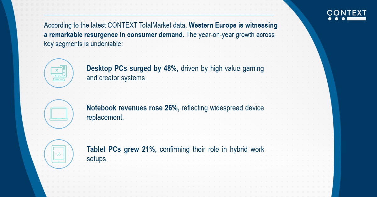 According to the latest CONTEXT TotalMarket data, Western Europe is witnessing a remarkable resurgence in consumer demand. The year-on-year growth across key segments is undeniable: