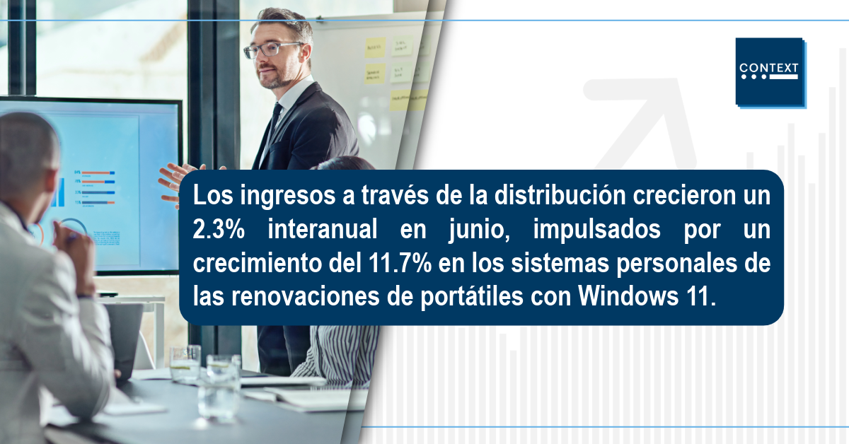 En junio, las ventas de ingresos a través de distribución experimentaron un aumento interanual del 2,3%, lo que refleja la continuación del impulso positivo del Q2, que registró un crecimiento general del 4,9% interanual. Si bien el ritmo de crecimiento en junio fue menor en comparación con los aumentos observados en abril y mayo, el impacto de los sistemas personales siguió siendo significativo. Cabe destacar que la actualización de portátiles con Windows 11 contribuyó a un sólido aumento de las ventas en esta categoría, que registró un impresionante crecimiento del 11,7% interanual. El sector de infraestructuras también tuvo un buen desempeño, con un aumento del 4% interanual en junio. Sin embargo, otros segmentos enfrentaron desafíos, como el de telecomunicaciones, que experimentó una caída del 6,9% y el de software y servicios, que cayó un 0,4% durante el mismo período. A nivel regional, los países nórdicos mostraron el mayor crecimiento de ingresos, logrando un impresionante incremento interanual del 21%.